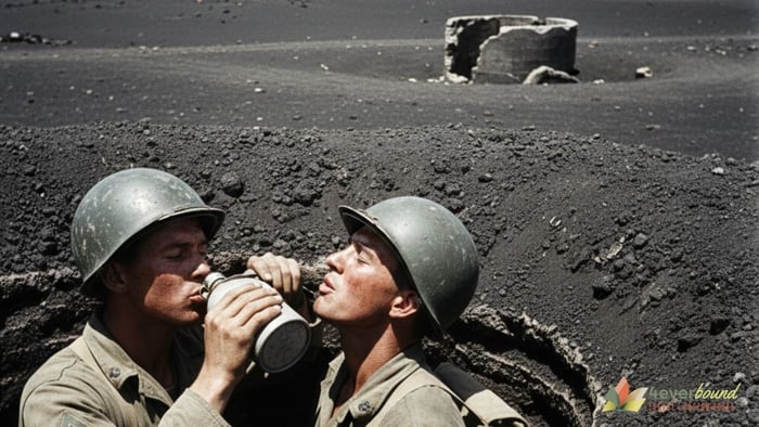 Adding to these challenges was Iwo Jima's critical water shortage. The island had no natural fresh water sources, forcing Marines to rely on captured Japanese rainwater cisterns and inadequate desalination units that couldn't meet demand. The constant state of thirst and strict water rationing dominated daily life, making even basic hygiene a luxury. A single canteen became precious beyond measure, and the rare opportunity to wash with helmet water was considered extraordinary fortune.